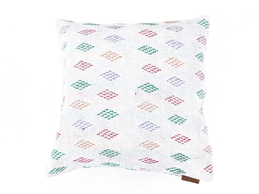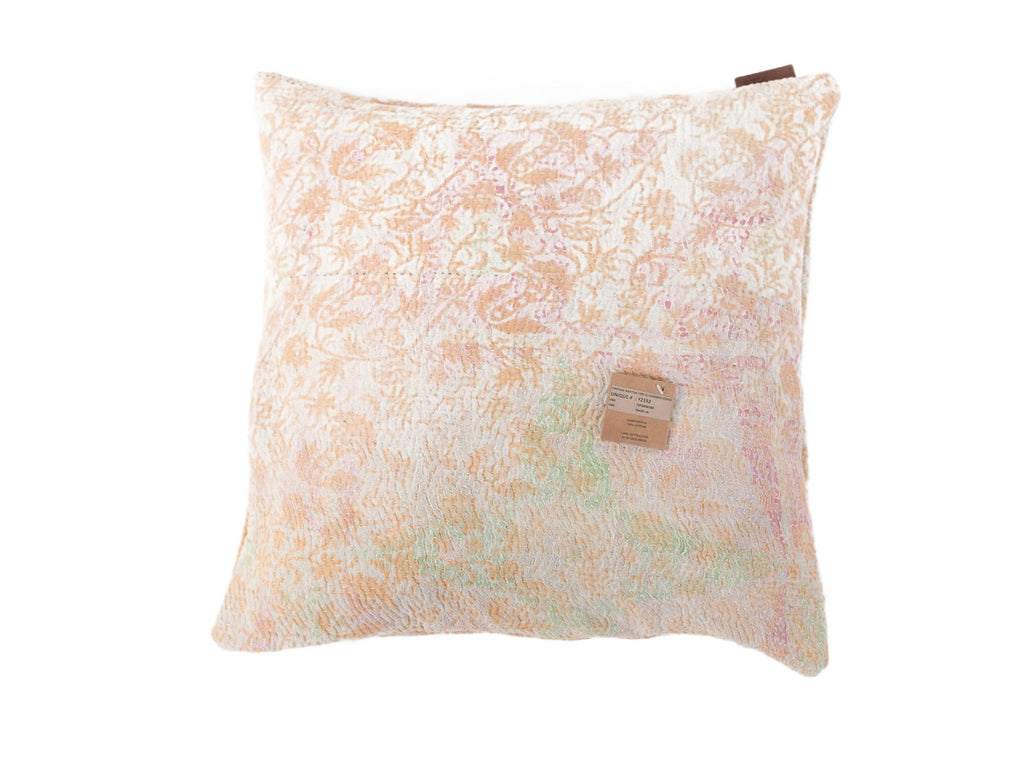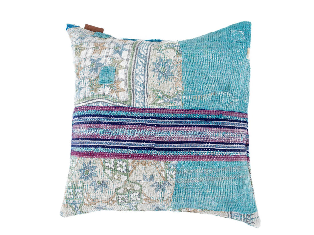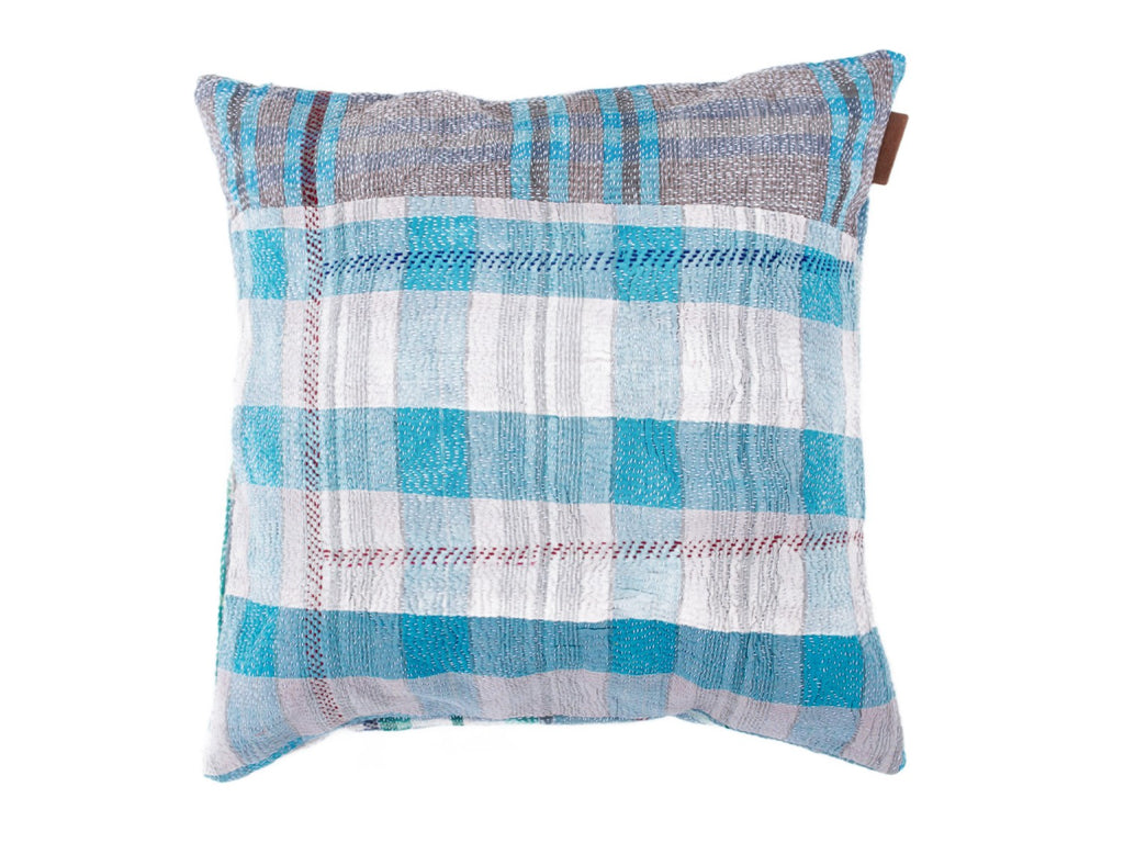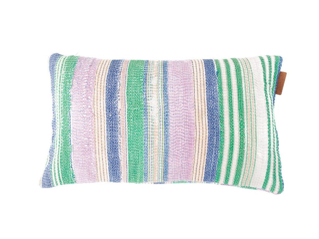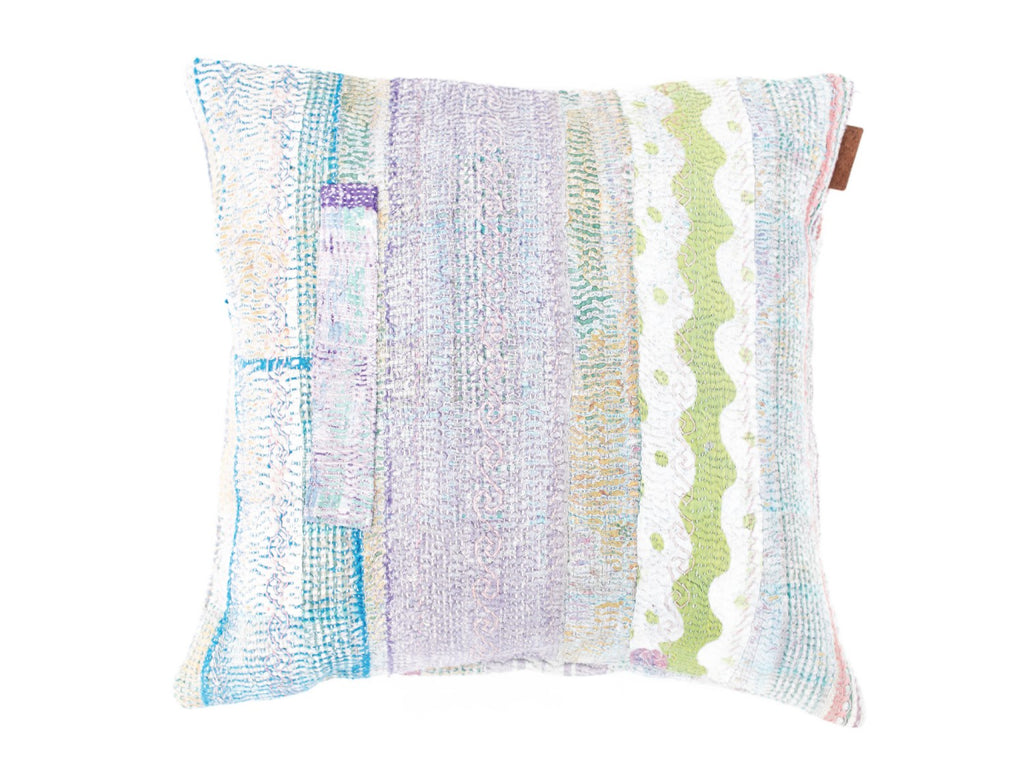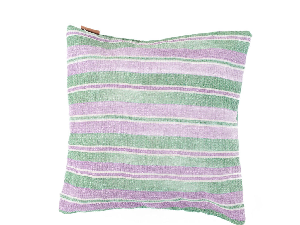 Fine Q are Sari cushions produced from a type of sari that has a different expression than our normal Sari Kantha cushions. They are made of thick recycled cotton sari laid together with several layers in between and with a worn look, where the saris inside help to give the whole pillow a very raw vintage look. They are toned down in colors and patterns and are sewn with smaller and tighter Kantha stitches, which give them an authentic look..