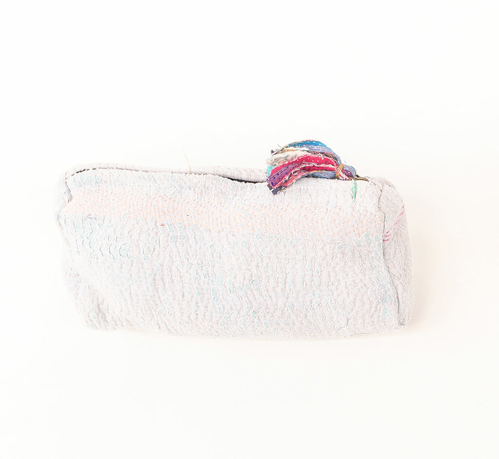 Details: Material: 100% vintage sari fabric (white/cream with block print), Size: 17 × 25 cm, Closure: durable zipper, Origin: handmade in India